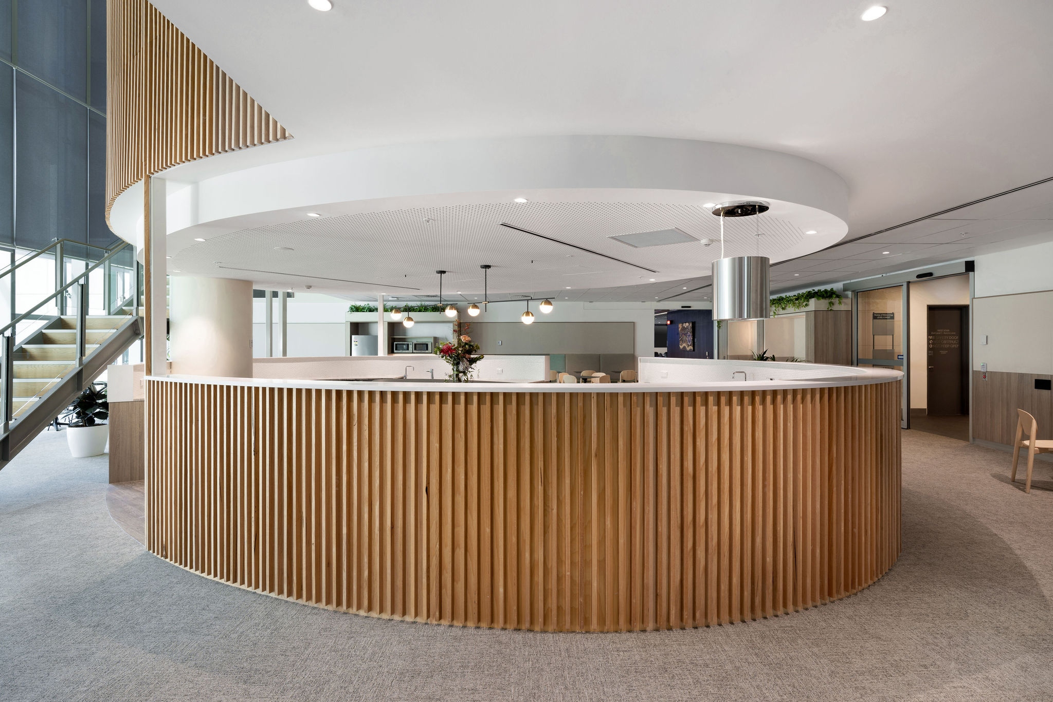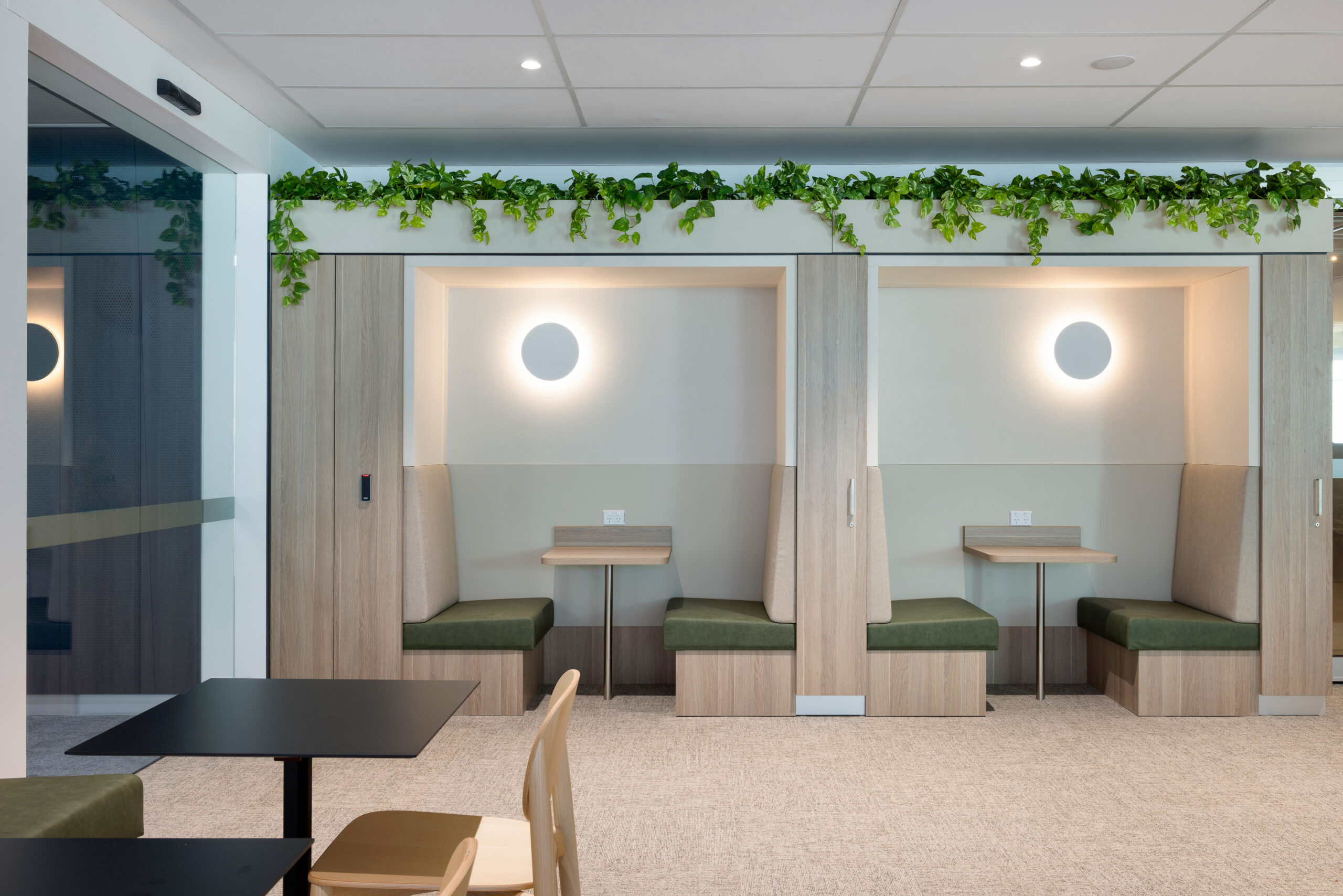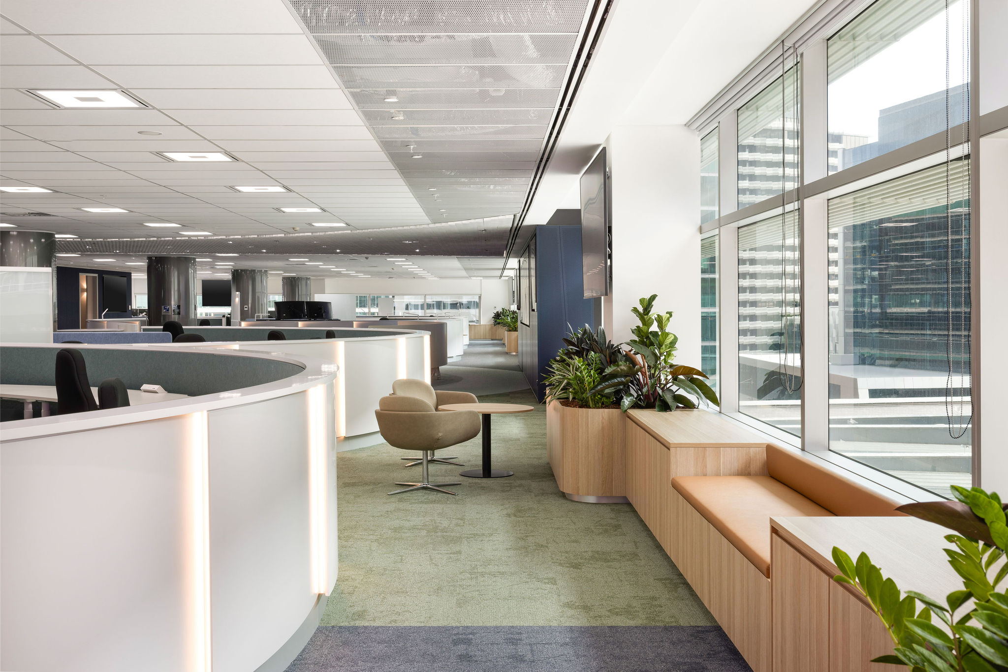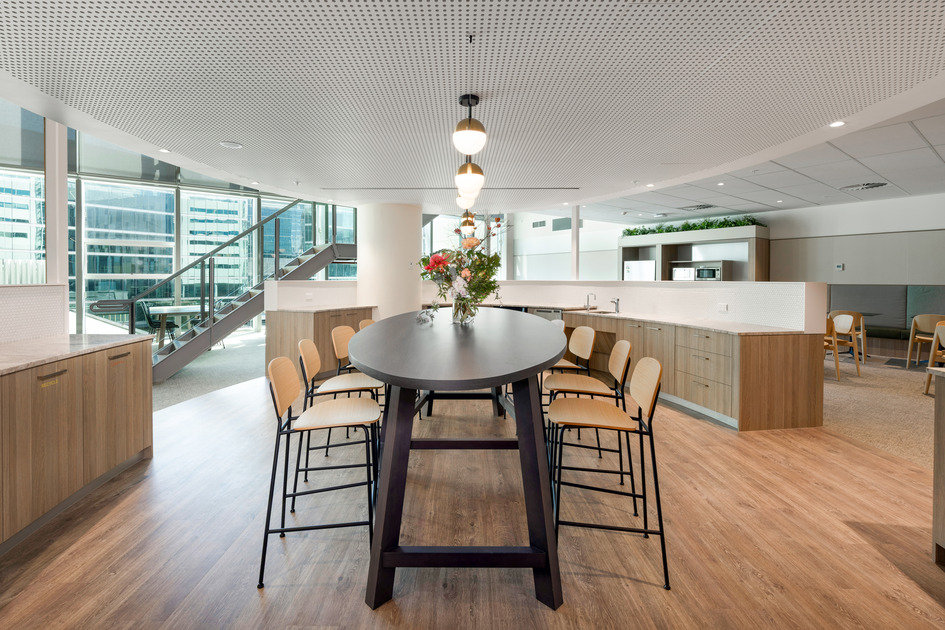 The West Wintergarden became a three‑storey breakout destination for staff, while the East Wintergarden offered new lockers and seating to enhance day‑to‑day workplace flow. Additional amenities included teapoints, first aid, focus and quiet rooms, and integrated banquette seating.