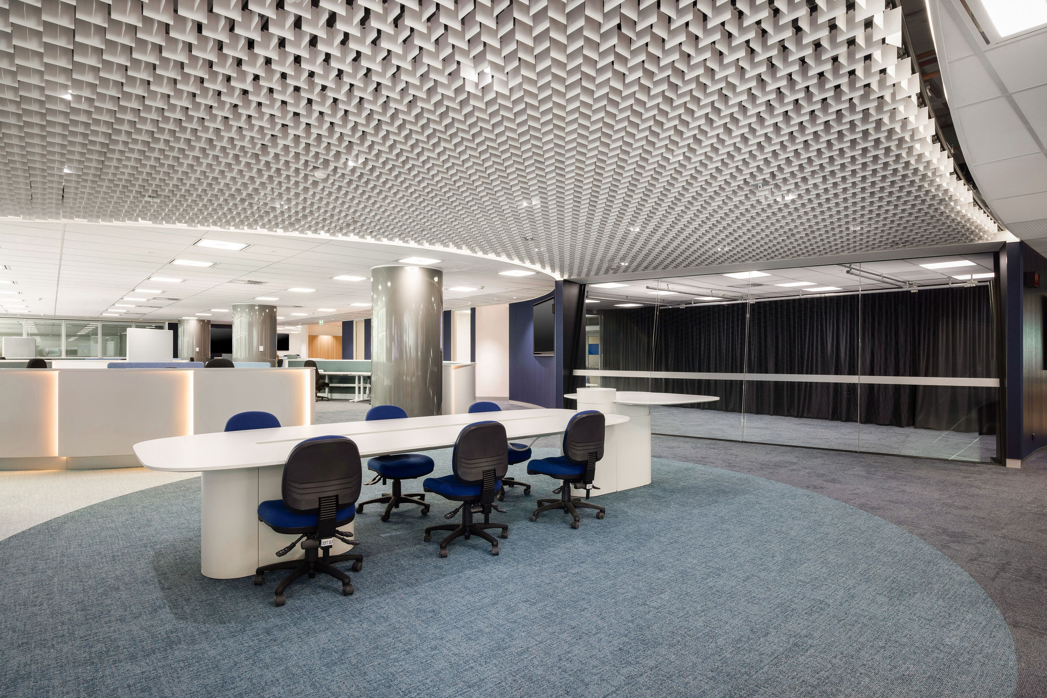 A people‑centred layout supported high‑intensity operations, with primary and secondary workstation zones to accommodate staff in different teams. Collaboration areas, meeting rooms, and a media centre with custom angled glazing enabled quick communication and live broadcast capability. Flexible training and multifunction rooms with operable glazed walls supported changing operational needs.