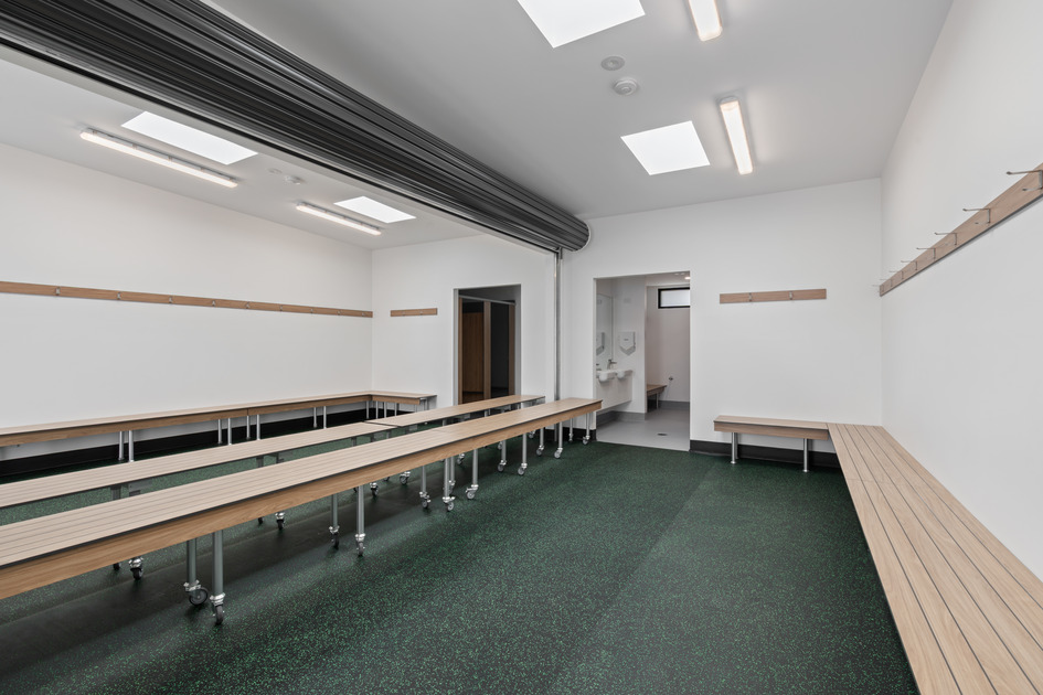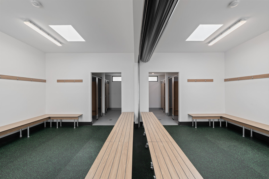 A standout feature is the extensive tiered seating overlooking the playing field. The largest delivered by the team to date, it creates a grandstand‑style viewing experience and strengthens the pavilion’s role as a central hub for players and spectators.