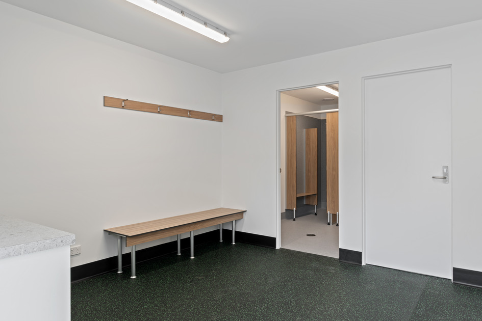 The new facility includes four flexible change rooms that can be reconfigured into two larger spaces, supporting junior, senior, male and female teams across both cricket and football. A generous social space with an operable wall connects directly to the change rooms, enabling the clubs to expand the area for events and presentations. Skylights provide natural light throughout the pavilion, while a large semi‑commercial kitchen supports match day and community functions.