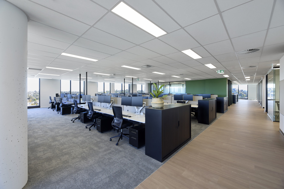 Levels 1 and 2 feature open-plan workspaces, large breakout areas, quiet rooms, boardrooms and a variety of meeting rooms, including a flexible conference space accommodating up to 100 people. The space was designed and delivered to a 5 Star Green Star rating, with an emphasis on occupant comfort, natural light and energy-efficient systems across heating, cooling and lighting.